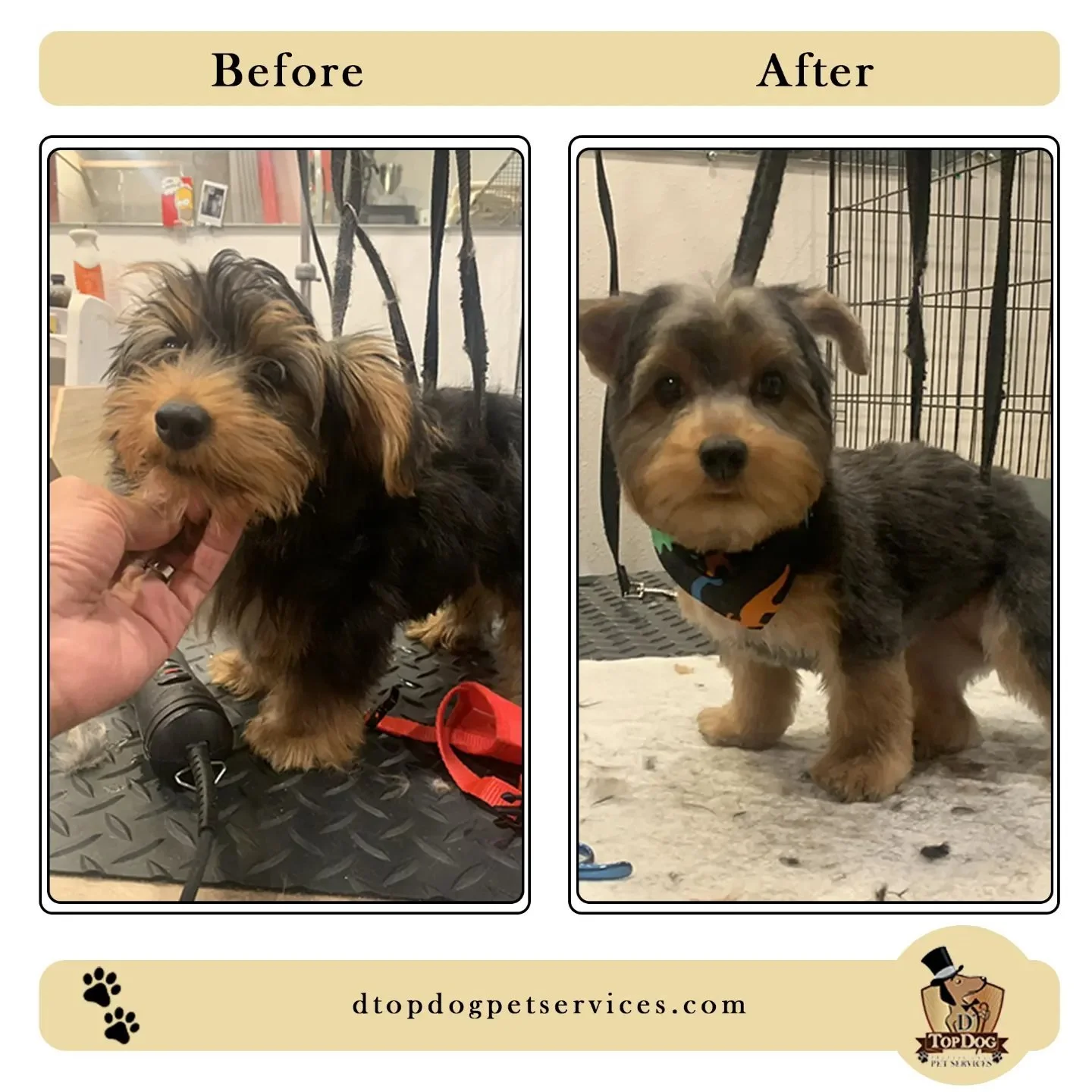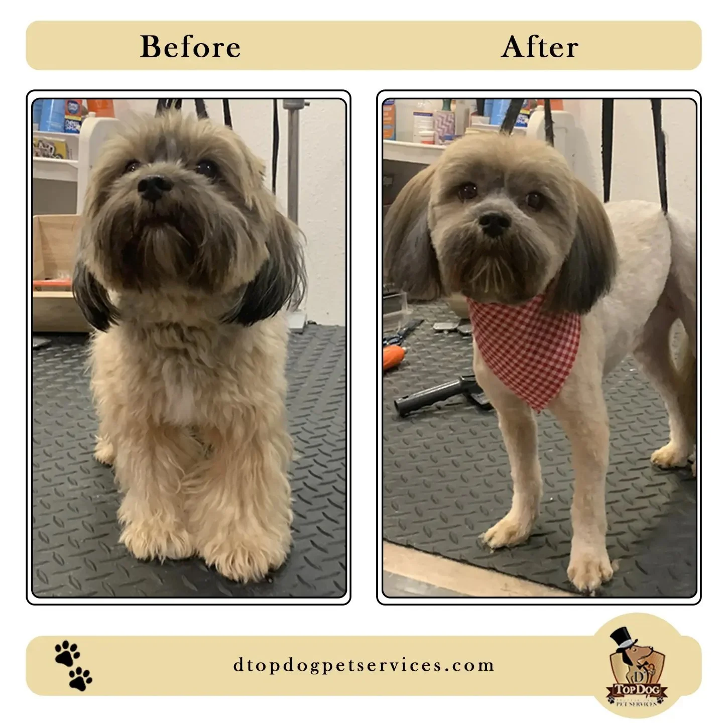 Side-by-side comparison of a small dog before and after grooming: the 'before' shows a fluffy, shaggy dog, and the 'after' shows a clean, styled dog wearing a red bandana.