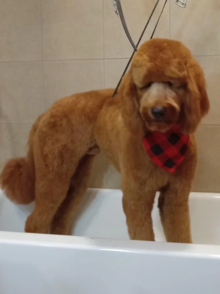 Dog with brown curly fur wearing a red and black bandana, standing in a white bathtub.